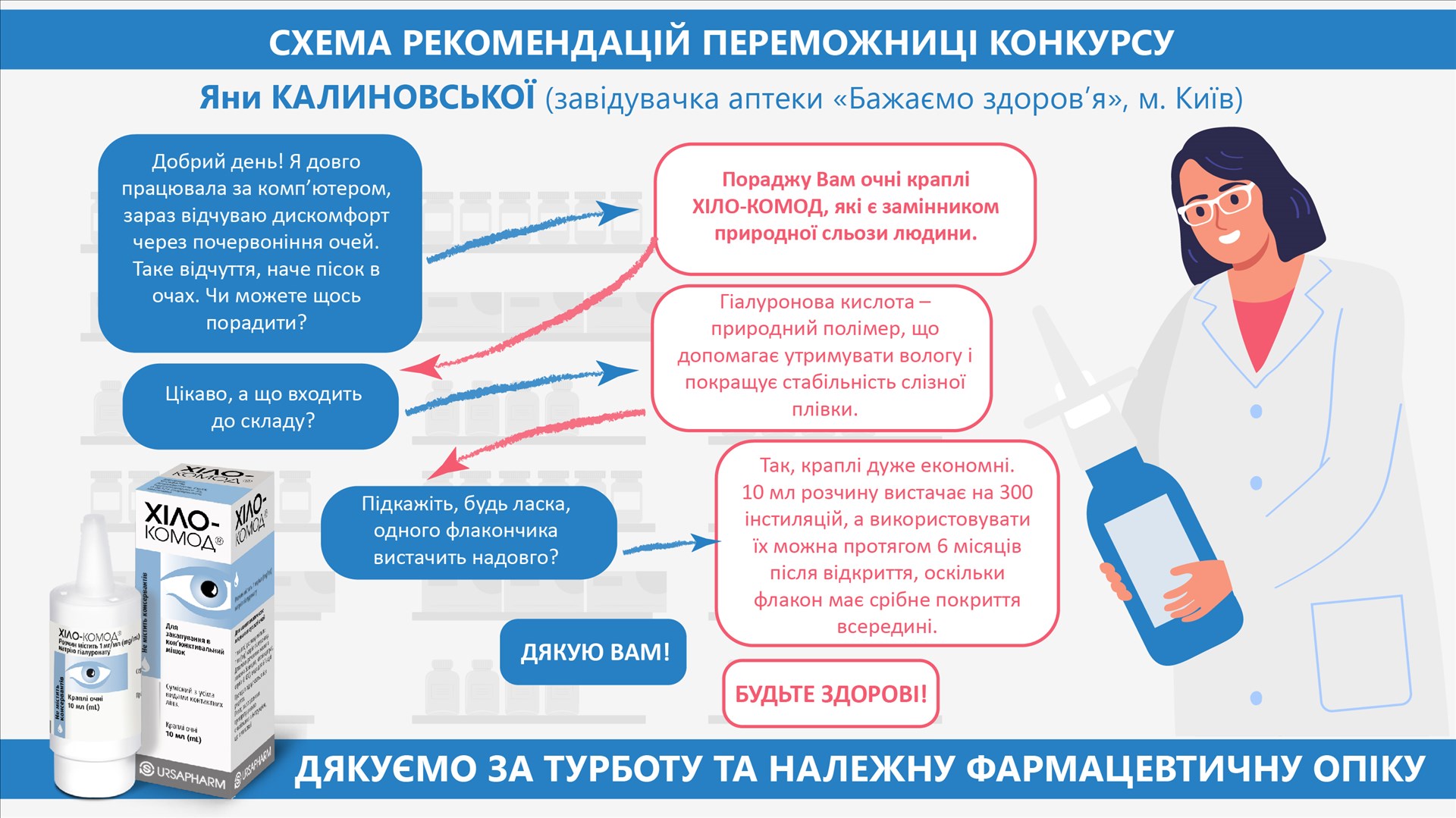 Фармацевтична опіка в аптеці передбачає консультування відвідувачів щодо способу застосування ліків. За необхідності такої консультації фармацевт повинен звернути увагу клієнта наособливості застосування очних крапель «ХІЛО-КОМОД».